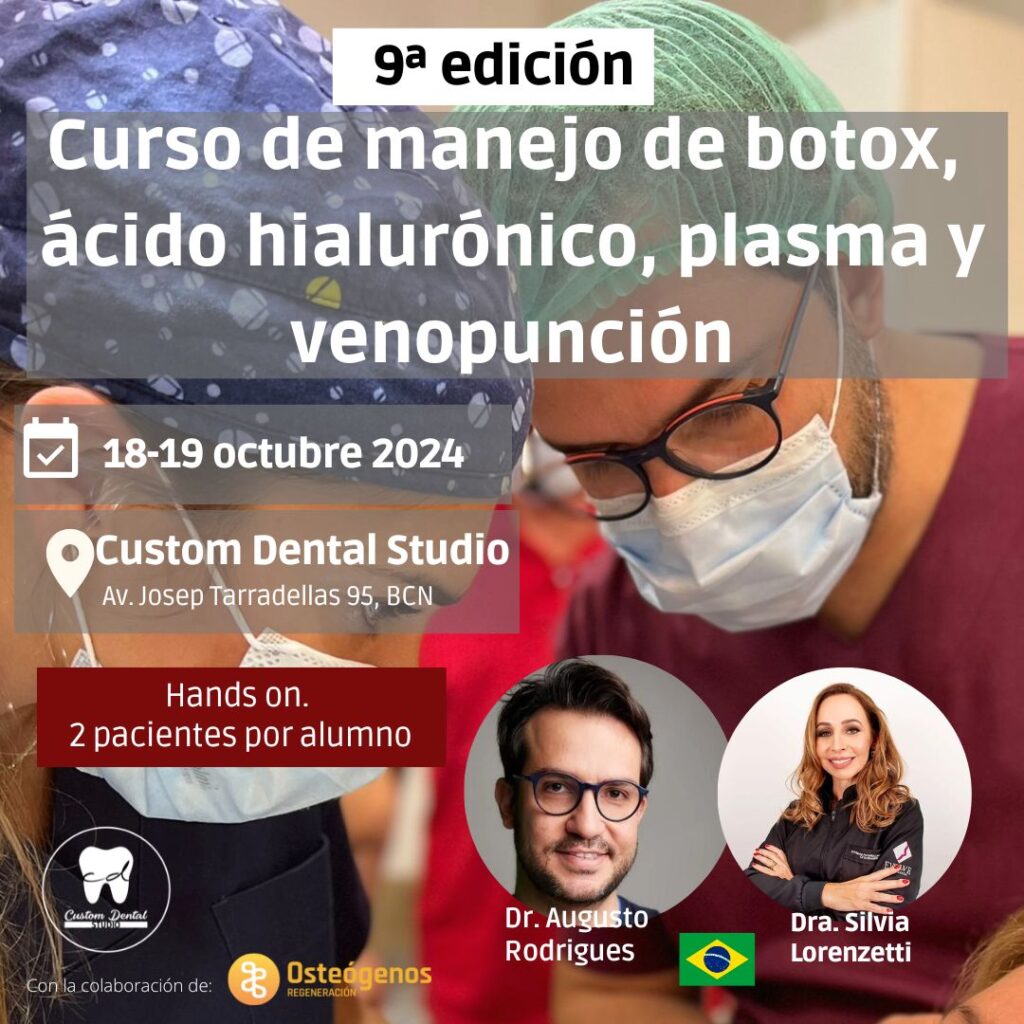 PROGRAMA DEL CURSO. Custom Dental Studio  – Av. Josep Tarradellas, 93 Barcelona Viernes 18/10/2024 10.00 – 10.30: Introducción, características estéticas faciales y envejecimiento. 10.30 – 11.30: Características del ácido hialurónico, rellenos de labios y surcos nasolabiales. 11.15 – 11.30: Coffee break. 11.30 – 14.00 Rellenos avanzados con  ácido hialurónico (mentón, mandíbula, pómulos y papilas). 14.00-15.00: […]